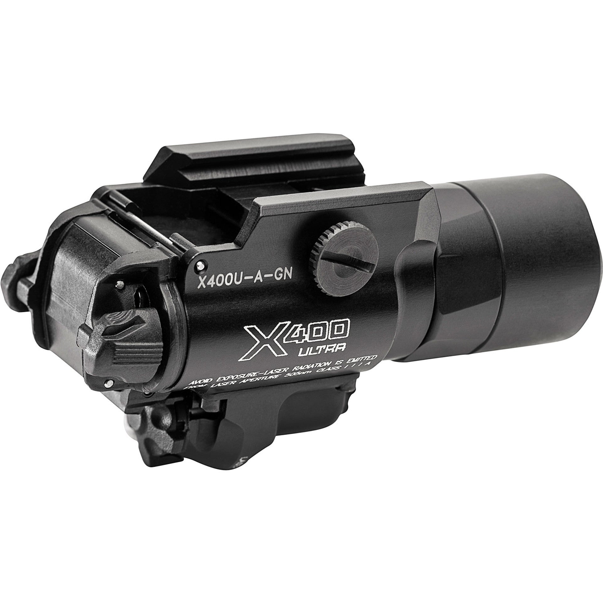 Pinpoint The Threat. The SureFire X400U is engineered to fit virtually any rail-equipped pistol. Its recoil-proof LED and TIR lens focus 1,000 lumens of light into a smooth, far-reaching hybrid beam with a large central spot and plenty of spill light, an extremely effective combination for close- to medium-range engagements. Available in traditional red (635 nanometers) or high-vis green (515 nanometers), its 5-milliwatt laser is highly visible to the human eye to help the user get on target quickly and accurately. With a Mil-Spec hard-anodized aluminum body that’s light, strong and weatherproof, it can handle hard knocks and stay in the fight. Mounting an X400U on your pistol or long gun is a clear sign that you take your security seriously.